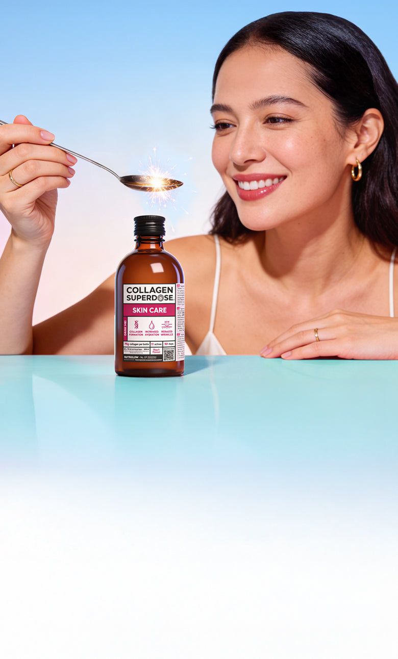 Hydrolysed marine collagen and vitamin C support natural collagen synthesis, while hyaluronic acid enhances hydration and elasticity.